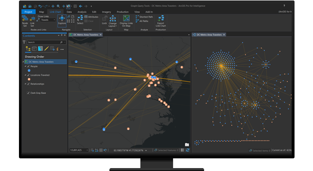 ArcGIS fournit un cadre pour le renseignement basée sur le recueil des activités : une méthode structurée utilisée pour améliorer la compréhension des réseaux, stimuler la collecte de nouvelles données et développer les connaissances. ArcGIS fournit également des outils pour fusionner les données et développer l'analyse des Pattern-of-life. Ces outils fonctionnent avec les big data et les outils en temps réel pour l'analyse du Geoint et soutiennent la méthode formelle.